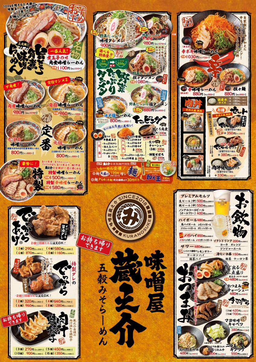 【 五穀みそらーめん 味噌屋蔵之介 】メニューページ ▼▼▼一部、特製だれのでっからあげが旨辛だれの店舗と、ドリンクの種類が違う店舗がございますので、詳しくは店舗まで直接問い合わせください。▼▼▼ 五穀味噌らーめん蔵之介〈アレルギー表示〉はこちら